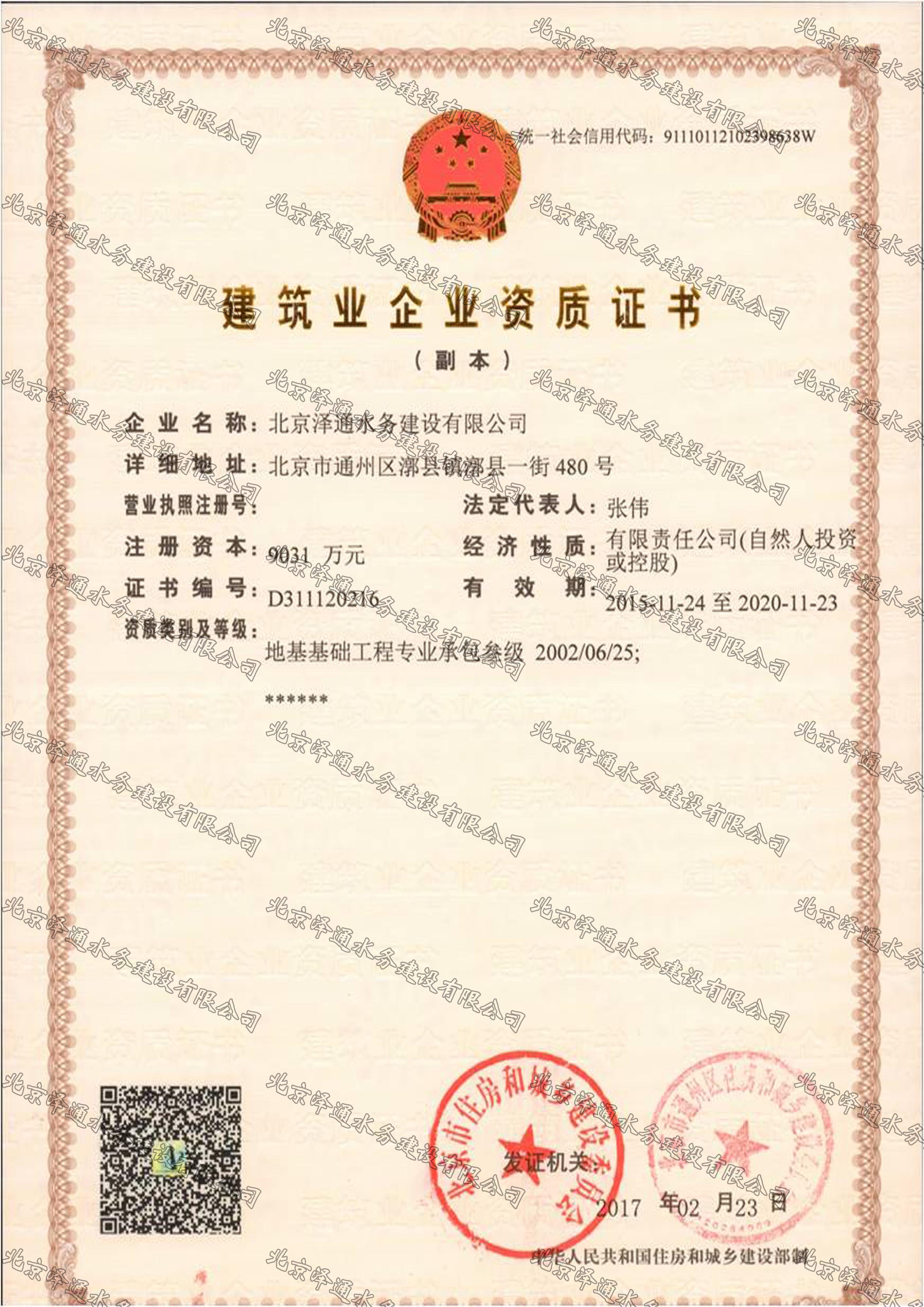 2、企業(yè)經(jīng)理具有3年以上從事工程管理工作經(jīng)歷;技術(shù)負責人具有3年以上從事地基與基礎(chǔ)施工技術(shù)管理工作經(jīng)歷并具有相關(guān)專業(yè)中級以上職稱;財務負責人具有初級以上會計職稱。